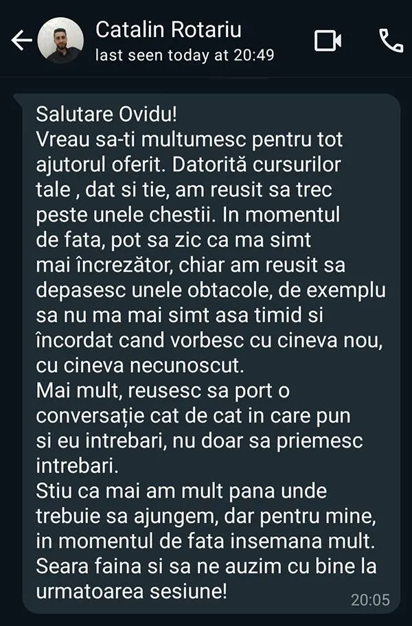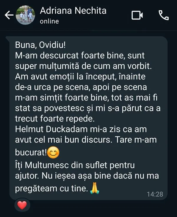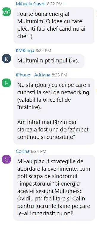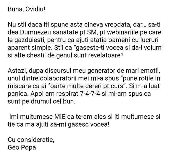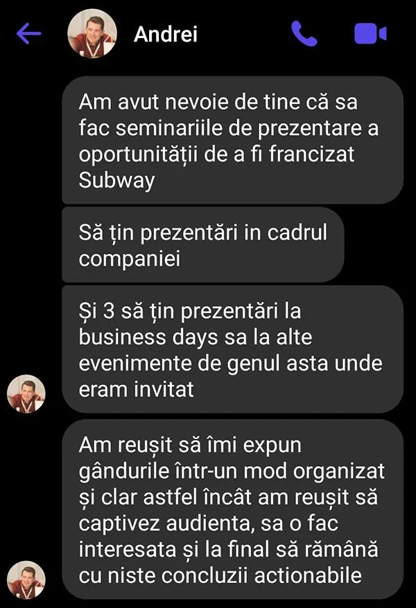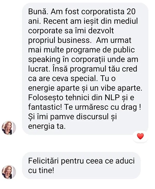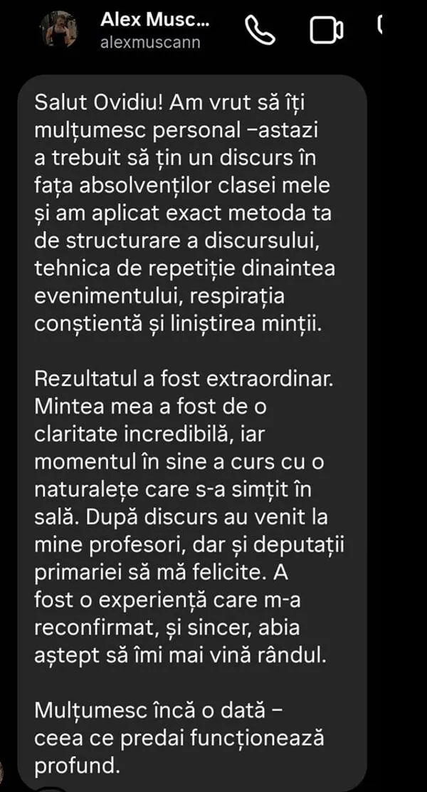 - Feedback personalizat de la mine sau echipa mea pentru 1 video/lună - ca să vezi exact ce te împiedică să fii convingător și cum să schimbi asta în 5 minute.