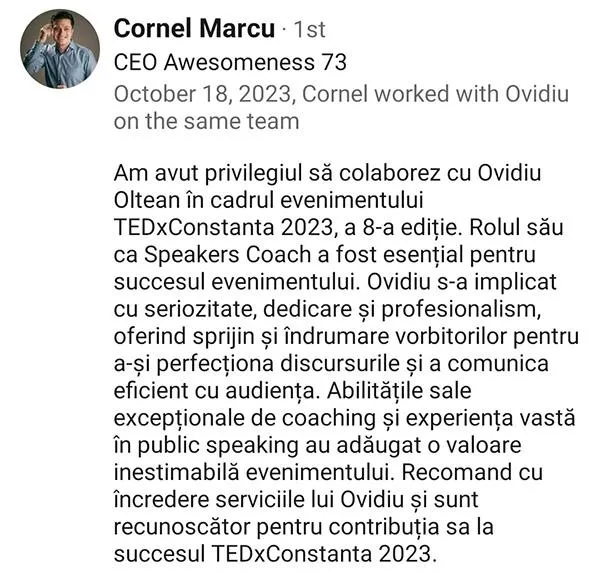 Sunt speaker TEDx și în prezent antrenez speakeri pentru evenimente TEDx.