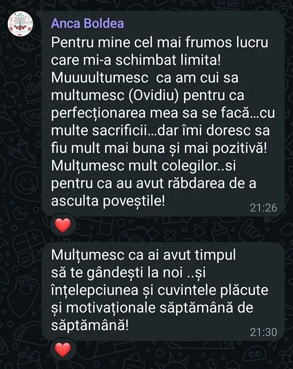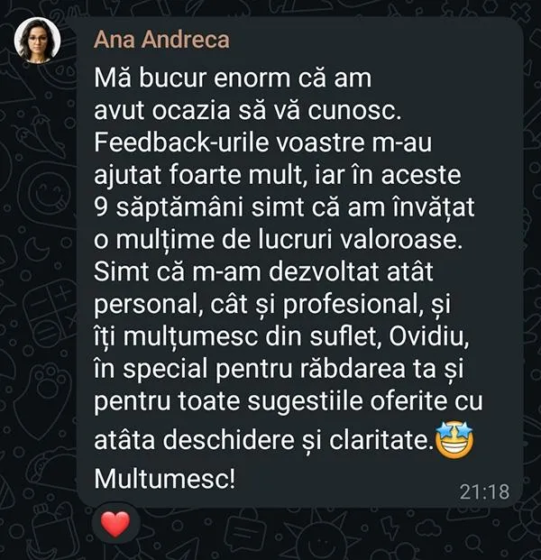Un spațiu în care poți exersa în siguranță și unde poți primi feedback personalizat atât de la mine cât și de la colegii tăi din grup care au trecut deja prin proces.