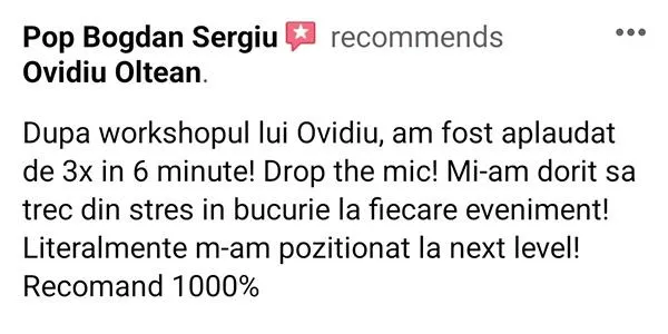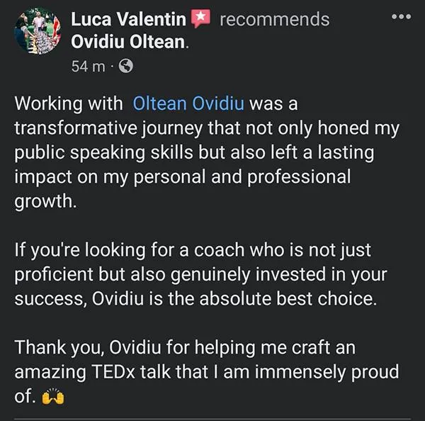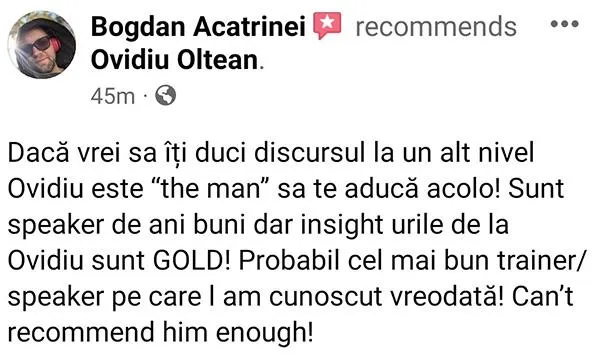 Numele eu este Ovidiu Oltean și în 2013 m-am îndrăgostit iremediabil de vorbitul în public. De acțiunea de a transmite mesaje care să-l inspire, motiveze și educe pe cel din fața mea.
