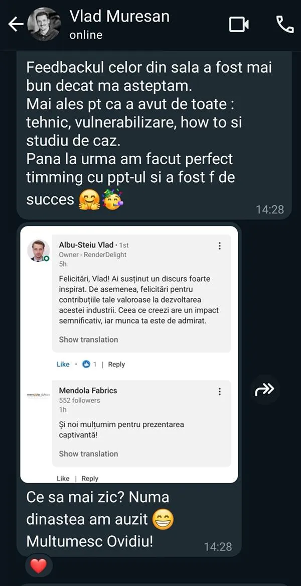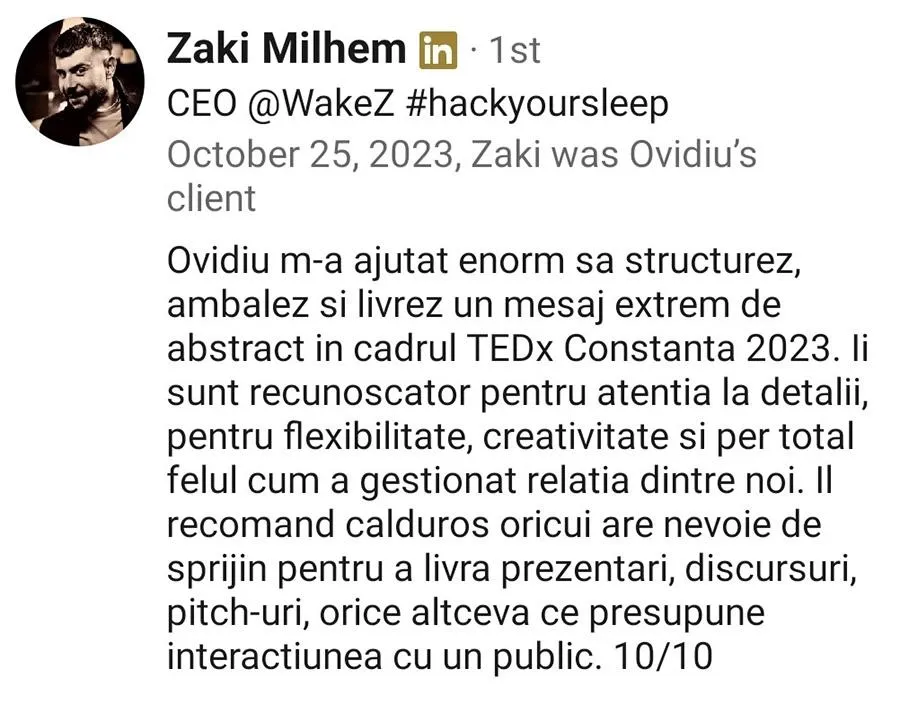 Am lucrat cu speakeri la evenimentele TEDx, manageri din companii precum BitDefender, Emerson, Lidl, Accesa, Endava, LSEG și echipa de traineri NATO HCOE Oradea.